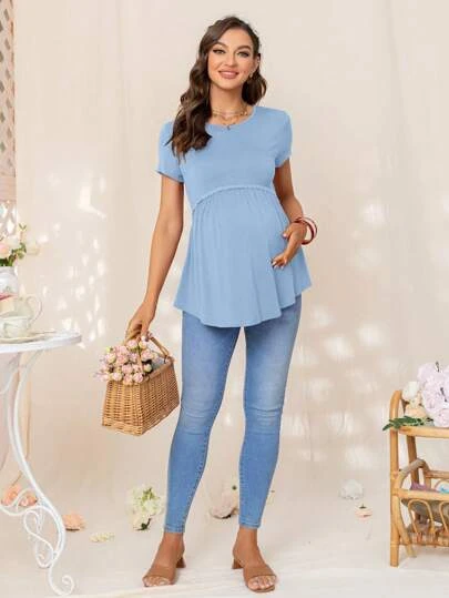 DEARCASE Maternity Solid Lace Trim Curved Hem Tee