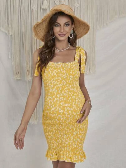Maternity Ditsy Floral Print Tie Shoulder Ruffle Hem Cami Dress