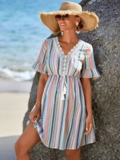 SHEIN Maternity Striped Print Guipure Lace Panel Tassel Tie Front Flounce Sleeve Dress