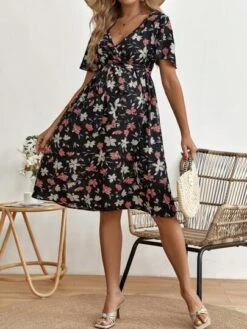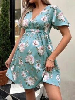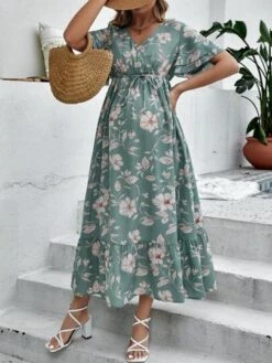 SHEIN Maternity Floral Print Butterfly Sleeve Belted Ruffle Hem Dress