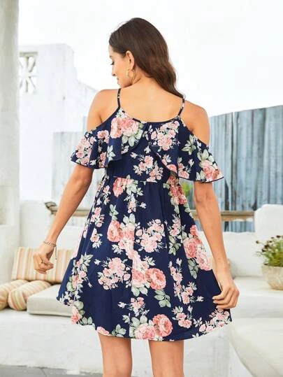 Maternity Floral Print Cold Shoulder Ruffle Trim Dress