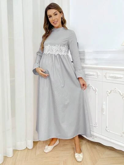 SHEIN Maternity Striped Print Guipure Lace Panel Tassel Tie Front Flounce Sleeve Dress