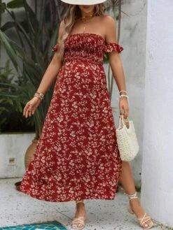 SHEIN Maternity Ditsy Floral Print Off Shoulder Top & Split Thigh Skirt