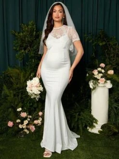 SHEIN Maternity Split Back Lace Top & Mermaid Hem Slip Dress Without Veil