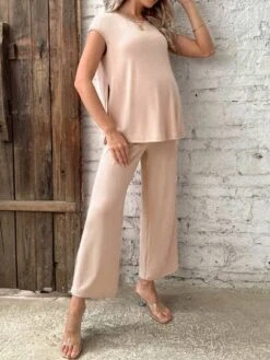 SHEIN Maternity Solid V Neck Tee & Adjustable Waist Leggings