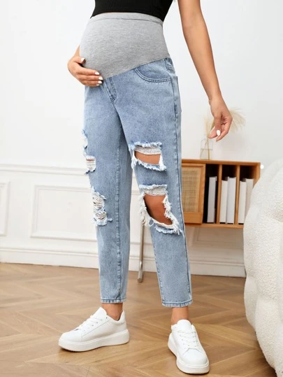 SHEIN Maternity Adjustable Elastic Waist Ripped Frayed Cut Out Jeans