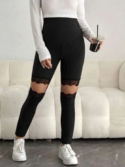 SHEIN Maternity Adjustable Waist Contrast Lace Cutout Leggings