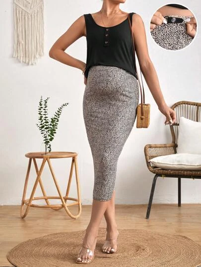 SHEIN Maternity Button Front Nursing Tank Top & Adjustable Waist Allover Print Skirt