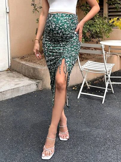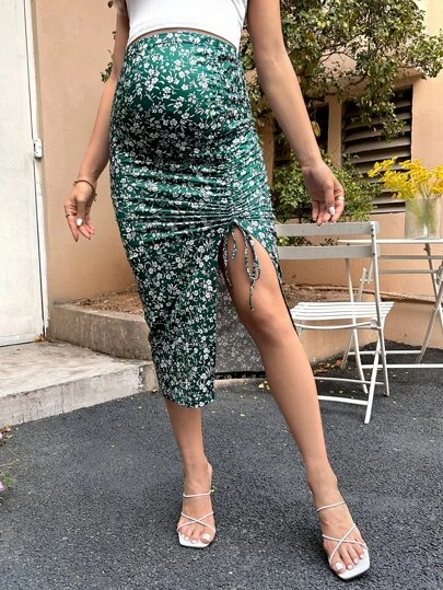 SHEIN Maternity Ditsy Floral Print Drawstring Split Thigh Skirt