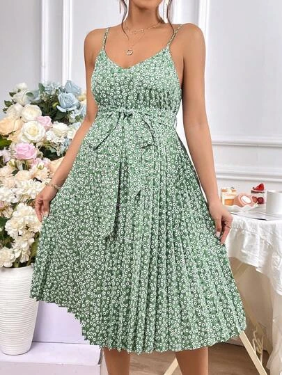 SHEIN Maternity Ditsy Floral Print Pleated Hem Belted Cami Dress