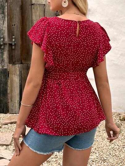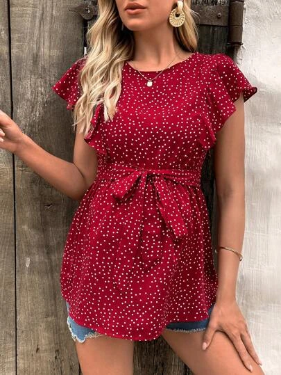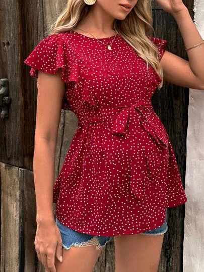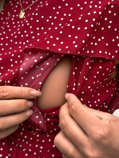 SHEIN Maternity Polka Dot Print Butterfly Sleeve Belted Nursing Blouse