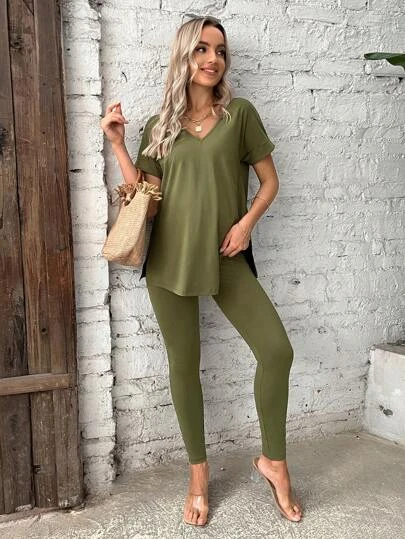 SHEIN Maternity Solid V Neck Tee & Adjustable Waist Leggings