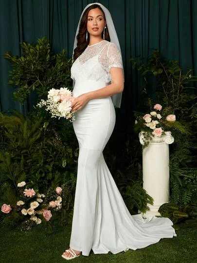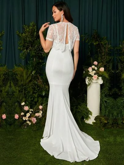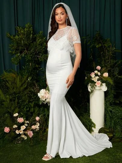 SHEIN Maternity Split Back Lace Top & Mermaid Hem Slip Dress Without Veil