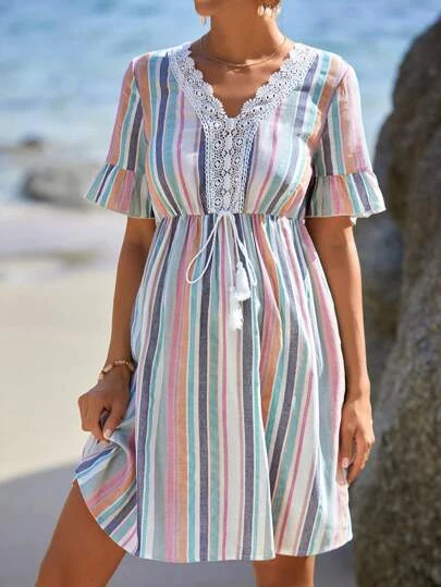 SHEIN Maternity Striped Print Guipure Lace Panel Tassel Tie Front Flounce Sleeve Dress