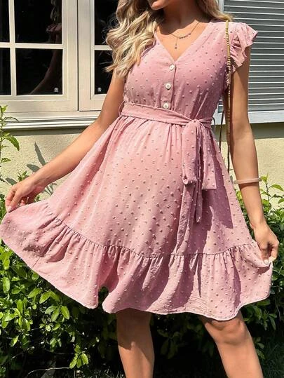SHEIN Maternity Swiss Dot Ruffle Trim Belted Dress