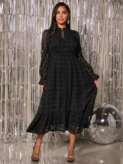 SHEIN Maternity Swiss Dot Tie Neck Flounce Sleeve Ruffle Hem Dress
