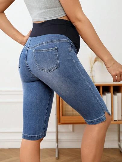 SHEIN Maternity Wideband Waist Bleach Wash Slit Hem Denim Shorts
