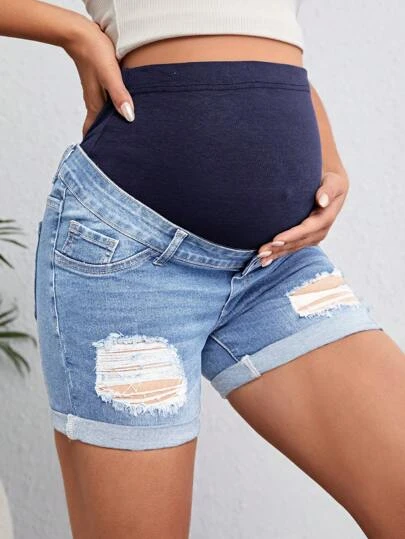SHEIN Maternity Wideband Waist Ripped Roll Up Hem Denim Shorts